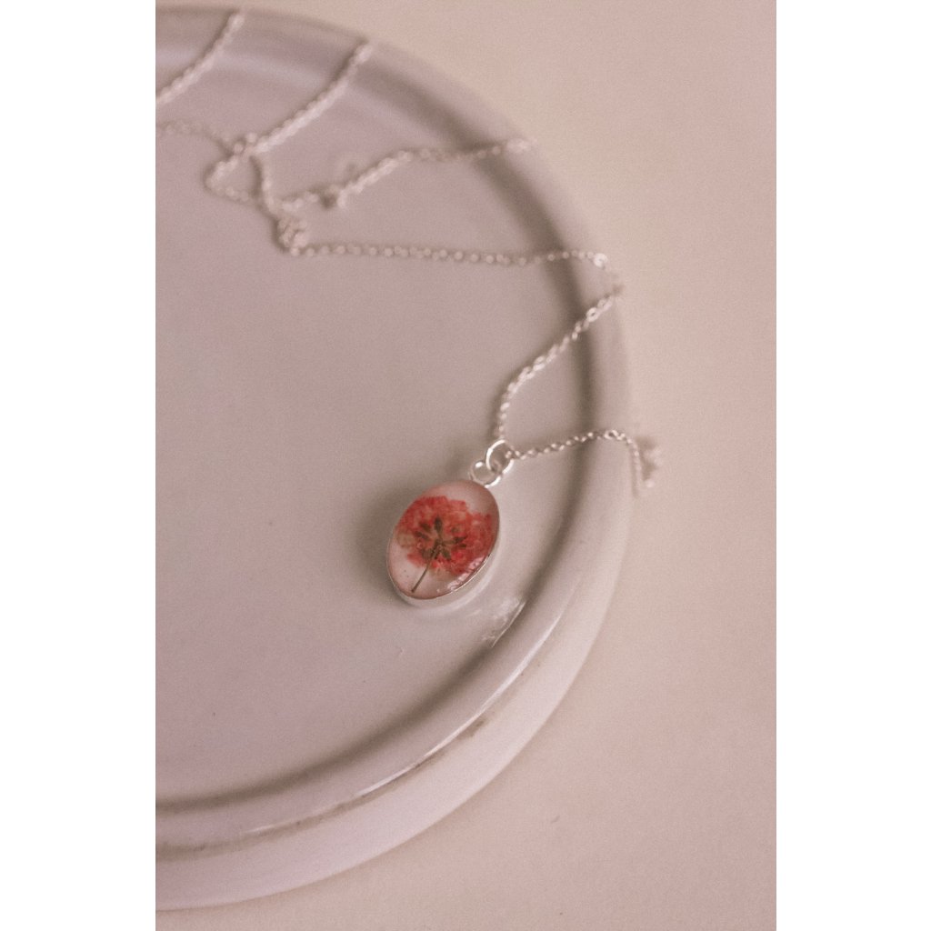 Ručně vyráběný náhrdelník Amálie mnohokvětá bude nápaditým, výraznějším a přesto elegantním kouskem Vaší šperkovnice. Je zdobeny sušenými lučními kvítky.