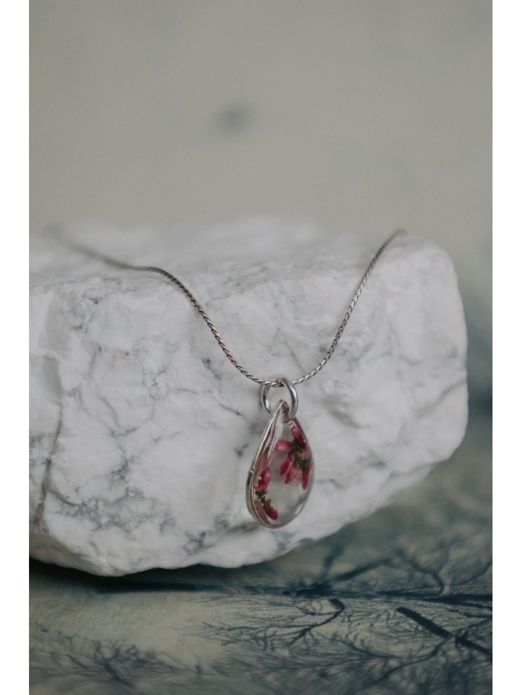 Parametry: Šperk je vyroben ze stříbra o ryzosti AG925/1000 zdobený sušenými kvítky vřesu. Hmotnost lůžka je 0,4 g (bez vylití pryskyřice). Řetízek má hmotnost 1,2 g. Jelikož se jedná o ručně vyrobený šperk, může se jeho hmotnost lehce lišit. Konkrétní hmotnost Vašeho šperku naleznete ve faktuře.