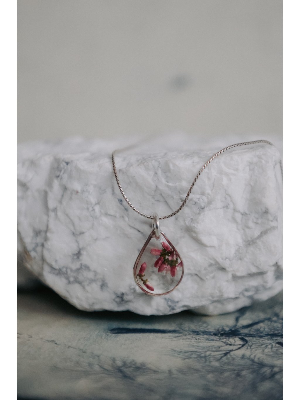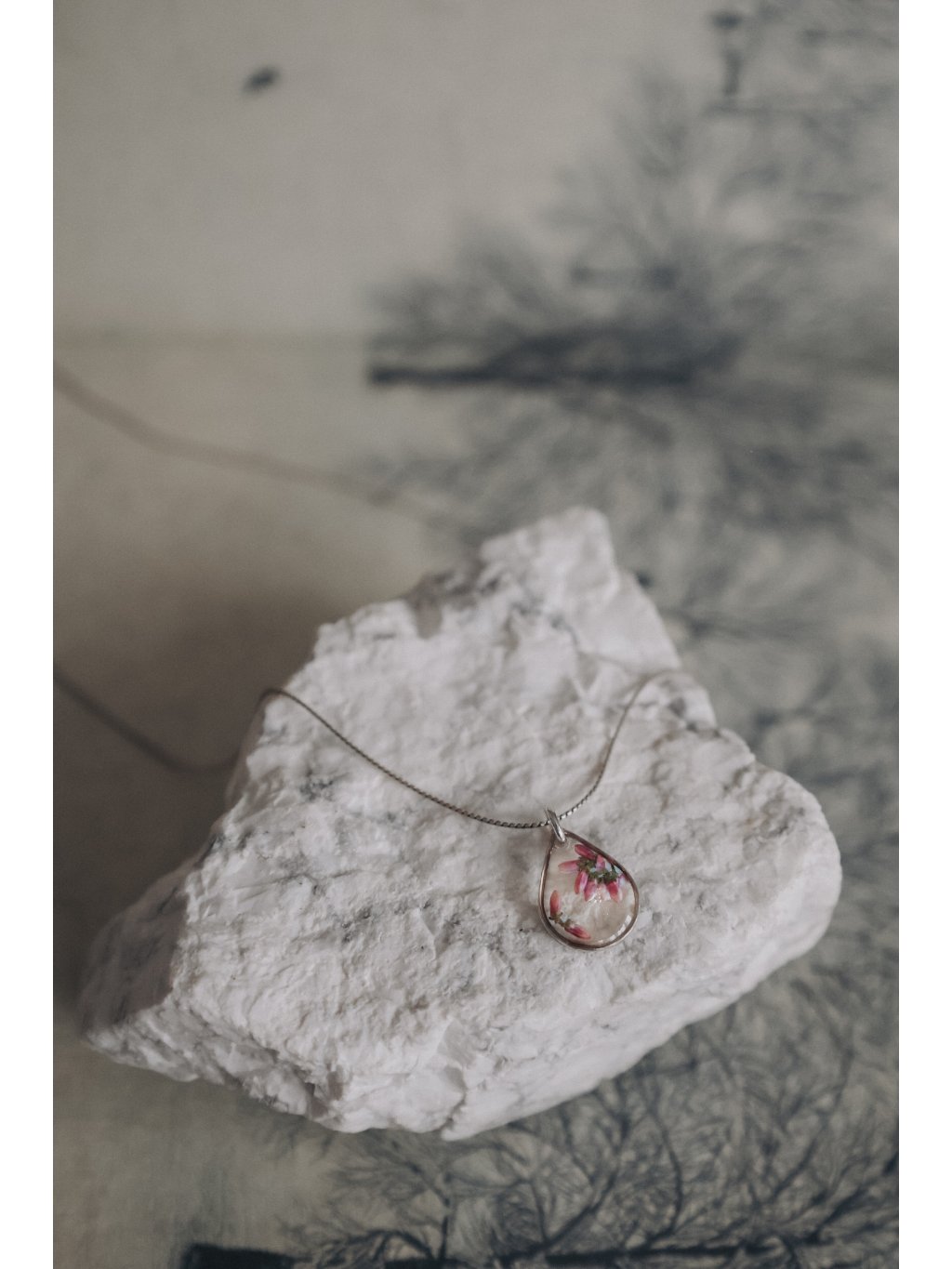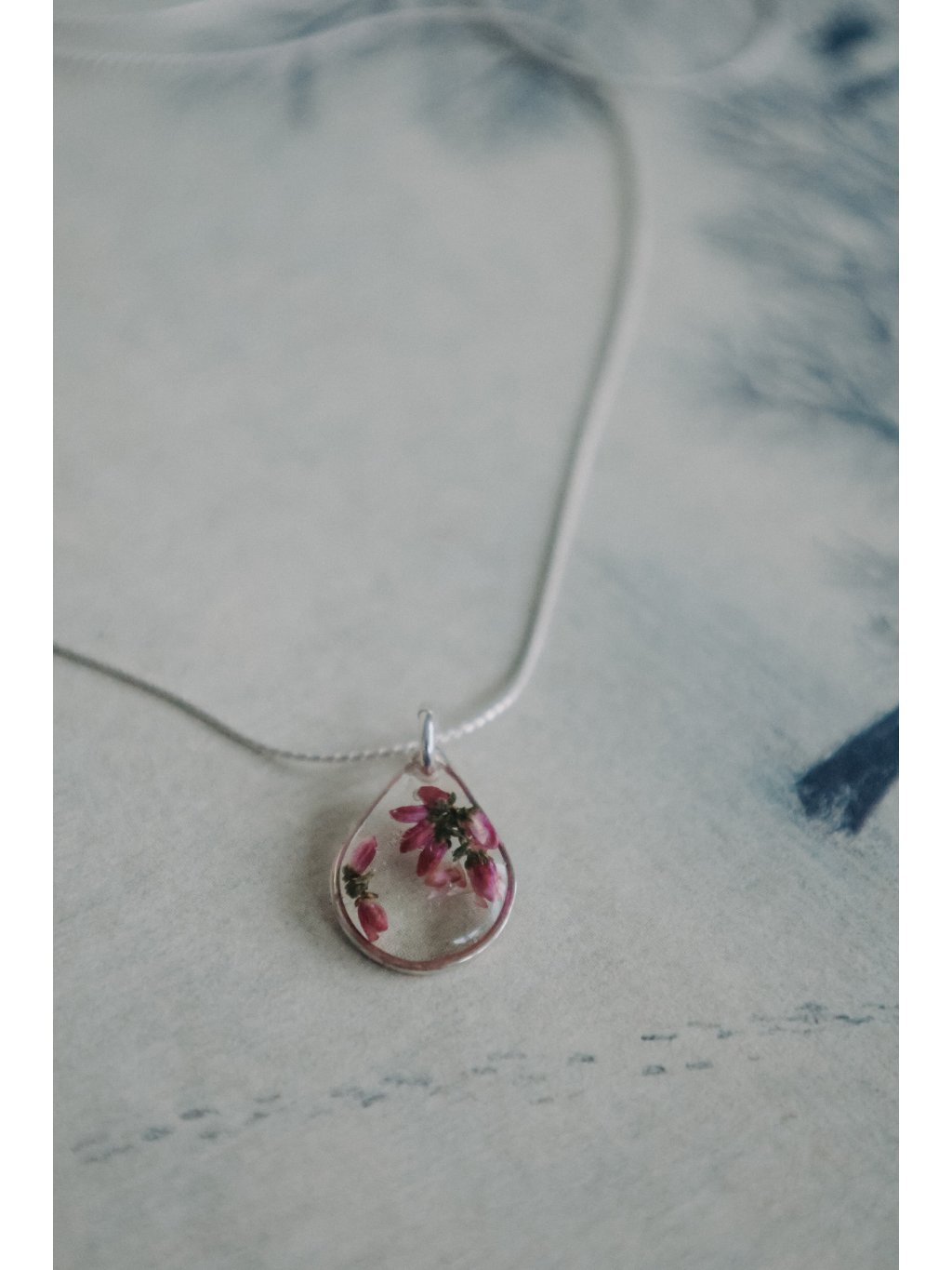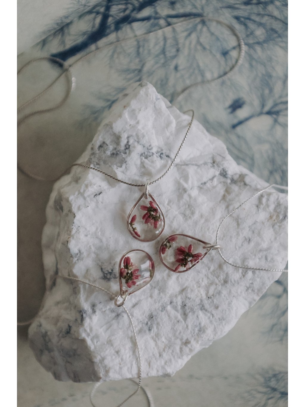 Ručně vyráběný náhrdelník Kapička je jemný a elegantním kousek pro Vás. Je zdobeny sušenými vřesovými kvítky.
